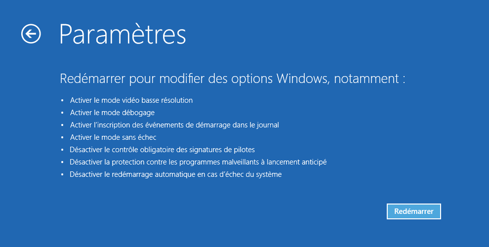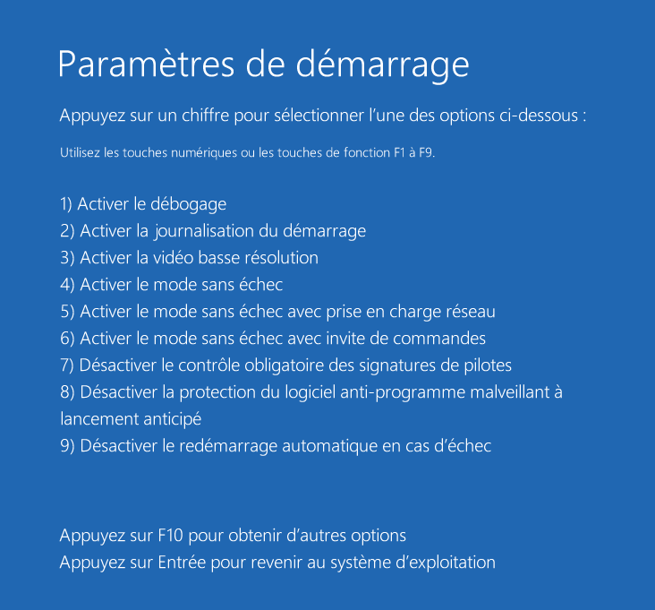 Après le redémarrage apparaît un écran de paramètres de démarrage interactif.